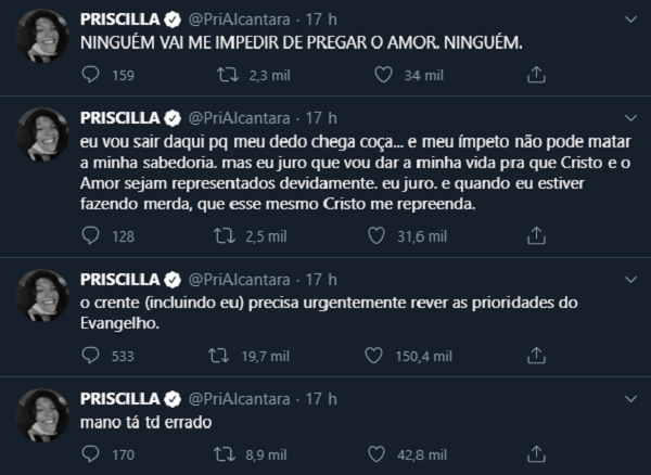 A cantora gospel Priscilla Alcantara utilizou seu Twitter para se manifestar a respeito da jovem de apenas 10 anos de idade que foi submetida a um aborto legal no Recife, depois que foi estuprada pelo tio e engravidou.